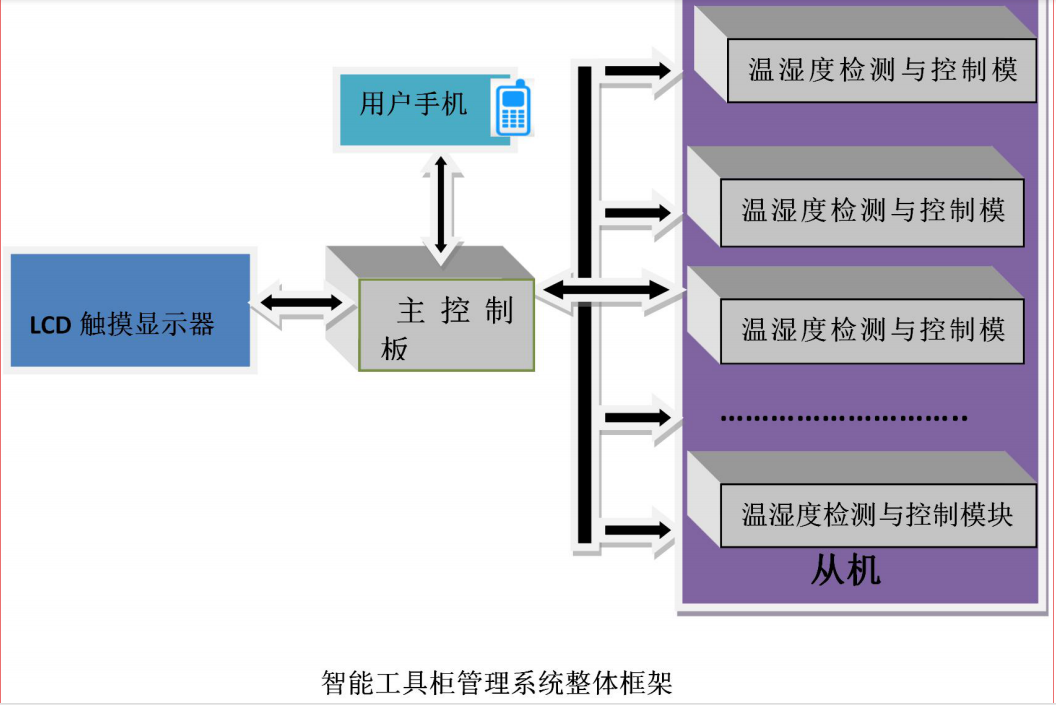 智能工具柜管理系統(tǒng)由 LCD 觸摸顯示屏、主控制板,多個從機模塊(溫濕度采集控制及工具位置信號采集)組成,具有以下功能特點: