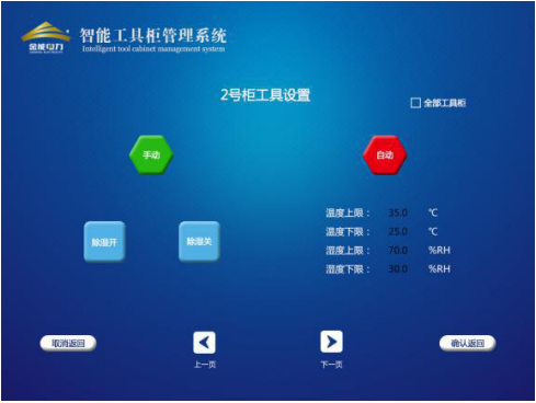 主頁(yè)數(shù)據(jù)顯示界面主要顯示的是各個(gè)柜子工具信息,包括柜內(nèi)、外溫濕度、工具名稱、配備數(shù)量、距檢天數(shù)、在位數(shù)量、在位情況等信息。編號(hào)圖標(biāo)顯示紅色則表示離位,綠色則表示在位。上下頁(yè)按鈕可進(jìn)行各柜子頁(yè)面切換。該界面還配有開(kāi)門、設(shè)置、查詢界面的按鈕。狀態(tài)一欄有自動(dòng)、手動(dòng)兩種狀態(tài),表示的是此號(hào)柜中除濕機(jī)的工作狀態(tài)。自動(dòng)狀態(tài)下,當(dāng)溫、濕度達(dá)到設(shè)定的范圍值則除濕機(jī)會(huì)自動(dòng)打開(kāi)或者關(guān)閉。手動(dòng)狀態(tài)下,可以強(qiáng)制打開(kāi)或者關(guān)閉除濕機(jī)。